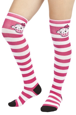Sourpuss cupcake socks look good enough to eat! These pink & white striped thigh high socks have a skull cupcake featured on each side with black toes & heel.