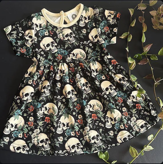 Introduce your little one to the magical world of cottagecore with our exquisite Short Sleeve Dress, featuring a captivating floral skull print. This enchanting design harmoniously combines delicate flowers with whimsical skull motifs, creating a look that is both charming and unique.