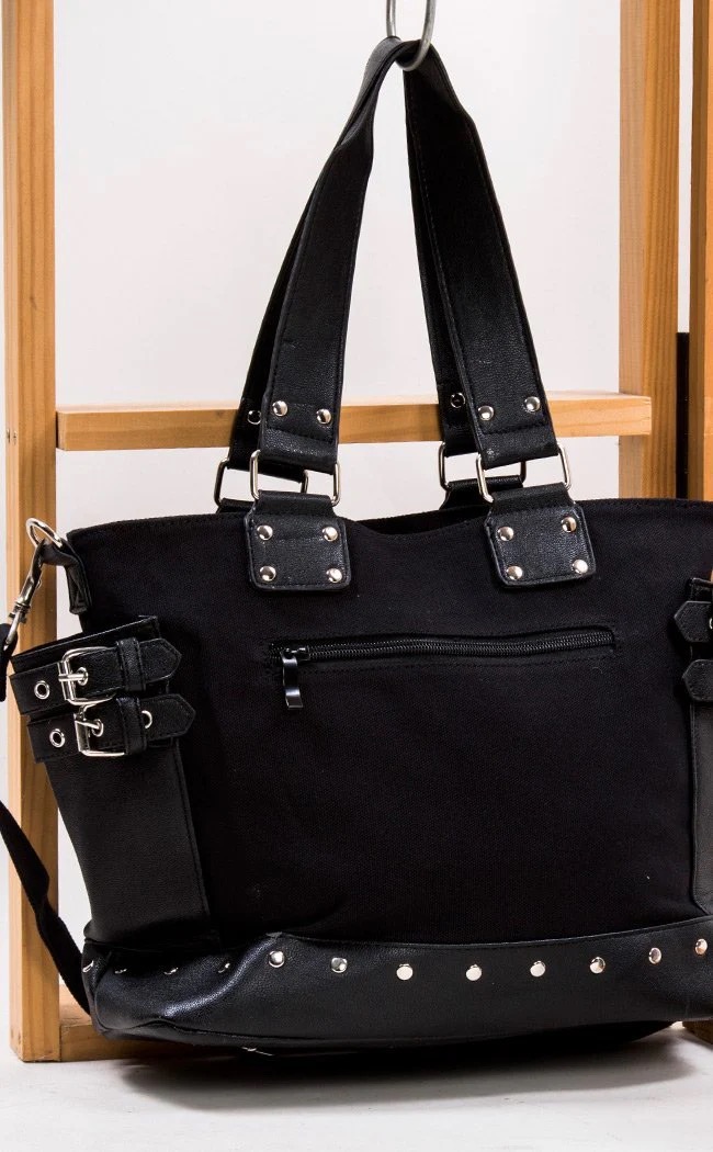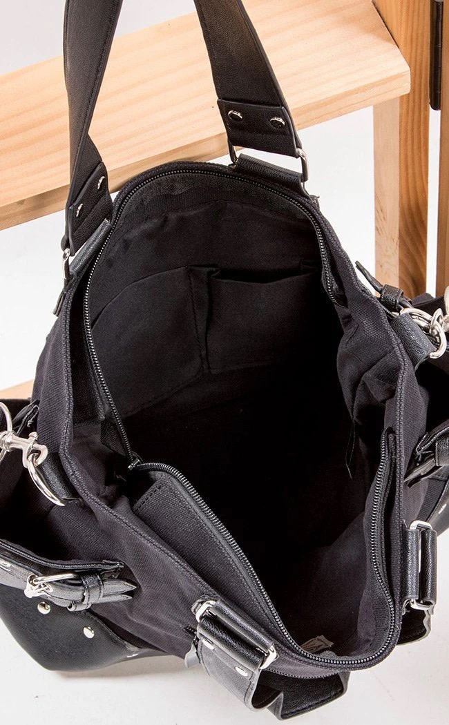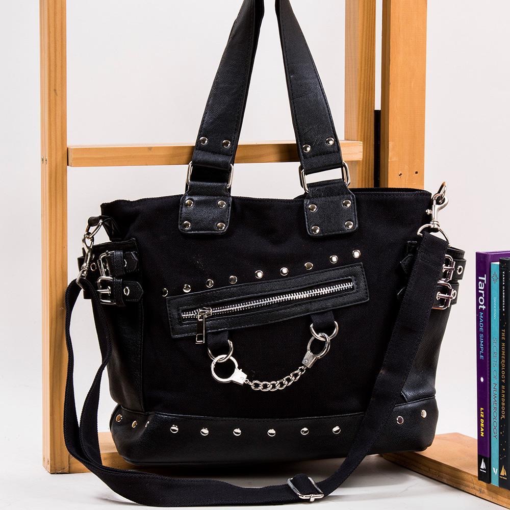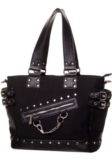 A bondage style handbag for your alternative accessory collection, complete with metal stud work, buckled belts and a handcuff charm across the front.