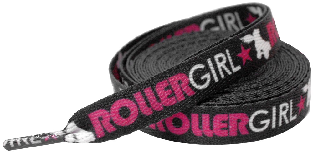 Derby gals, these laces were made for you! Black laces with a repeated pattern of “Roller Girl” written in pink and white alongside a silhouette of a winged roller skate.