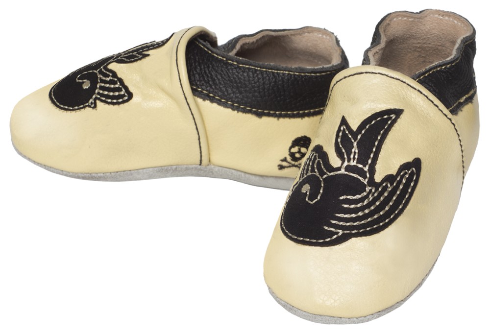 How about some tattoo flash to cover those itty bitty feet with! These super soft & flexible, leather crib shoes features a sparrow applique on each.